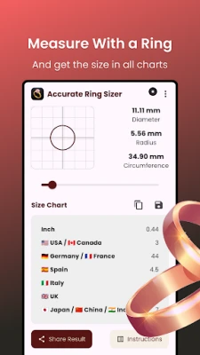 Accurate Ring Sizer App paistab silma oma erakordse täpsusega, võimaldades teil mõõta sõrmuse läbimõõtu, raadiust ja ümbermõõtu kuni 0,01 mm täpsusega. Meie uuenduslik kalibreerimisfunktsioon tagab, et saate mõõta enesekindlalt, kasutades reaalseid objekte veelgi usaldusväärsemate tulemuste saamiseks. Lisaks toetab rakendus globaalseid suurusstandardeid, konverteerides teie mõõtmised hõlpsasti USA 🇺🇸, Ühendkuningriigi 🇬🇧, Euroopa 🇪🇺, Austraalia 🇦🇺, Jaapani 🇯🇵, Hiina 🇨🇳 ja India 🇮🇳 suurusteks ning pakub paindlikult nii meetermõõdustiku (mm) kui ka imperiaalühikuid (tollid).