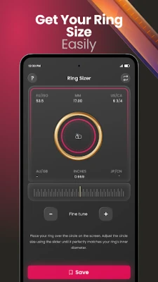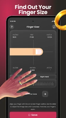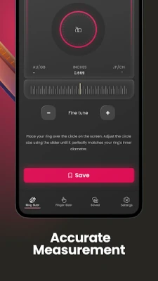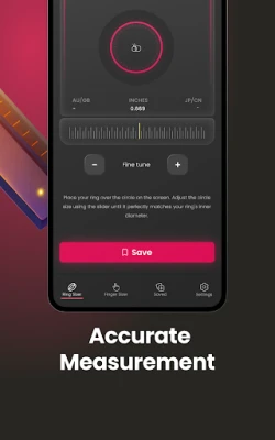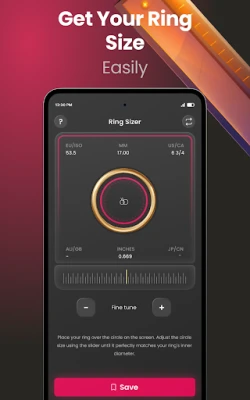 Ring Sizer viib mugavuse täiesti uuele tasemele oma nutika sõrmusesuuruse leidja funktsiooniga. Asetage lihtsalt oma sõrm ekraanile ja rakendus näitab teie suurust reaalajas, pakkudes kiiret, lihtsat ja hämmastavalt täpset tulemust. Lisaks ei pea te enam muretsema rahvusvaheliste standardite pärast. Ring Sizer toetab laia valikut suuruseid USA-st, Ühendkuningriigist, Euroopast, Austraaliast, Jaapanist, Hiinast ja mujalt, kindlustades, et leiate alati sobiva suuruse ükskõik millise maailma piirkonna ehtele.